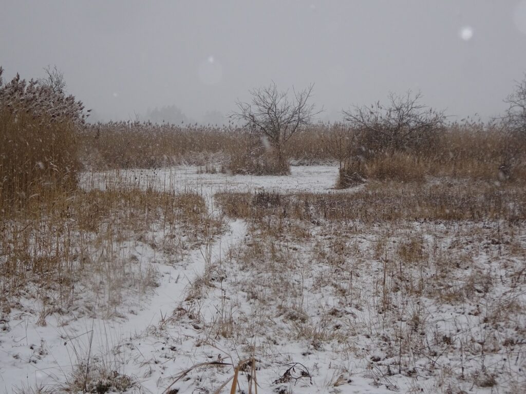 No, a ukázal se nám v parku jestřáb. Asi byl úspěšný někdy předešle a tak si souřadnice „uložil“. Máme toho tu pro něj dost, zavírat před nosem mu určitě nebudeme. Je samozřejmě ostražitý ale netuší, že jej sleduji z maringotky. Že nejsem taky dnešní. Zrovna jsem studoval od kolegy z party v časopise Zahrádkář, jak pečovat o květnaté louky. Většinu věcí ze stránek už ale vím. Teď k louce dorazí pravá zima a zavře jí okenice. Má to tak ovšem v optimu být.