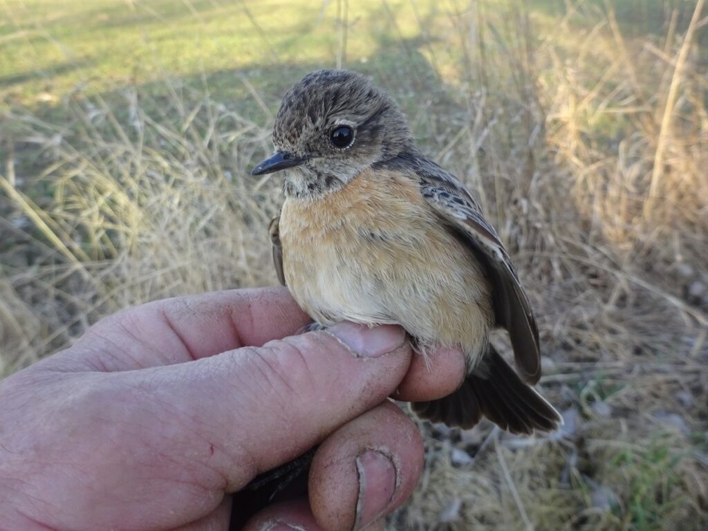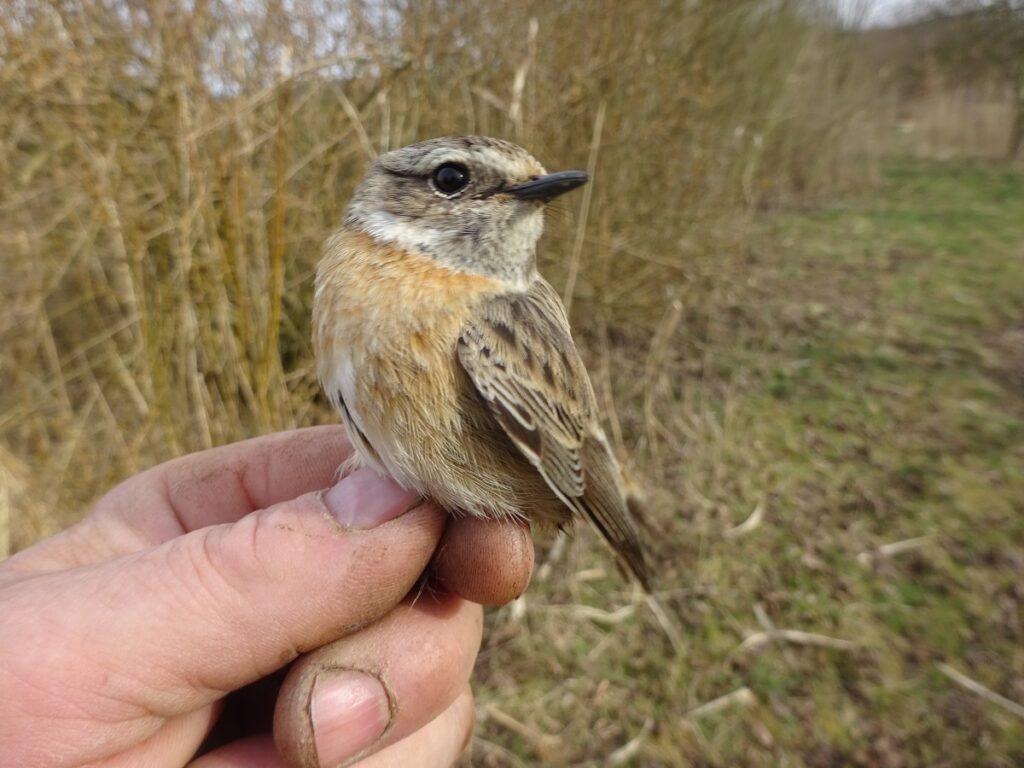 Sedím na akátovém zábradlí u jezírka v Slavičím háji. Děti se za mnou učí házet plechovku špagátem tak, aby včasným zatažením dovedly nabrat vodu. Já ale sleduji přes rákos na vloženém posezu z větve (má kovový bodec k lepší instalaci) černohlavého bramborníčka, abych po chvíli zjistil, že jen o kousek dál v mokřině je představitel páru druhého. To potěší. Potřebovali bychom takových mokřin víc. Vždyť tento druh býval tolik řídký v naší krajině. Prodlouženým pozorováním se domnívám, že ptáci to už jsou místní, jeden zcela jistě. Je milé sledovat jejich styl života. Trošku se na dálku mohou splést s modráčkem, který je rovněž co chvíli ve vzduchu. Jaro je k tomu nutí. V něm to, proč domů spěchali. Udělat vše pro rozmnožení. Mám prima pocit, že jim v tom mohu pomáhat. Ne tím, že očumuji, pomáhám nabídkami. Otevíráním dveří do nových příbytků, a když bych to uchopil politicky – pak tedy – „stříháním pásek“. Kde ovšem tak nějak postávám s nůžkami sám.