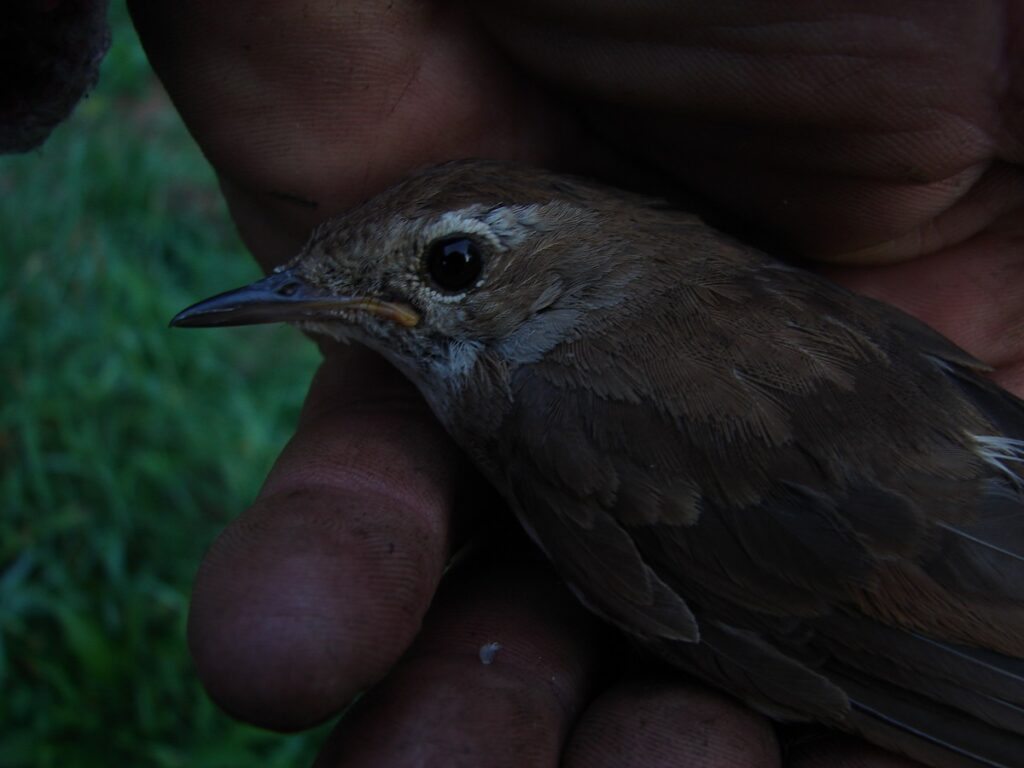 Tento jedinec zaujme z několika úhlů. Předně, má tmavý až černý zobák, což se často nestává. Ve Španělsku píší, že tací jsou staří – možná tento ano, ale dojem neplatí. Nicméně, tady jeden takový je. Pak je hned třeba poznamenat, že slavík je v procesu, působí tedy šatem „flekatě“. Dále je znatelný šedý límeček, což ovšem (občas zmiňované) jako znak čehokoli neplatí. Úkazu se též říká námrazový efekt. No, dále pohledem na krovky, které jsou v řadě nad velkými, jsou zajímavé světlé lemy (lépe vidět na fotce jiné, kterou jsem nepověsil). Konečně pozoruhodnost největší – protažený a poměrně světlý nadoční proužek, začínající v podstatě nad zobákem. Mám ovšem pocit, že pořád nejde o hledaného slavíka. Nicméně, z tisíců exemplářů tento nadočním proužkem zaujme. Jedinec byl i v horní rovině dvou hlavních náměrů. Nevím však, zda nevyvolávám úžas za každou cenu. Budu ještě pokračovat do současných ročníků a uvidíme.